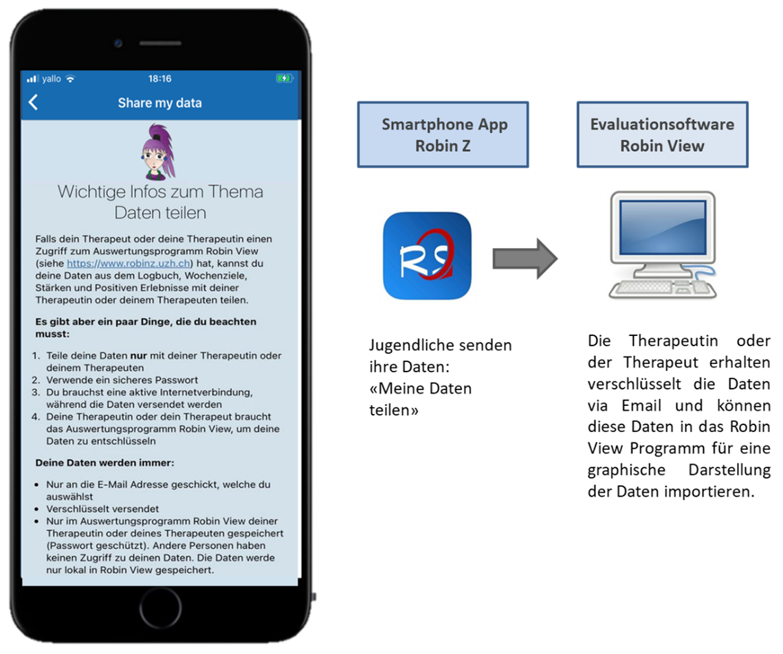 PatientInnen senden Ihnen ihre Daten verschlüsselt via die App Robin Z. Sie erhalten danach eine Email von technicrobin@kjpd.uzh.ch mit den verschlüsselten Daten. Diese verschlüsselten Daten können danach mit Robin View entschlüsselt und graphisch dargestellt werden. Eine Entschlüsselung dieser Daten ohne das Programm Robin View ist nicht möglich. Die Entschlüsselung der Daten ist weiter nur mit dem jeweiligen Passwort des Patienten möglich. Damit der Datenschutz gewährleistet ist, sollen Passwörter nur mündlich, nicht via Email, weitergeben werden.